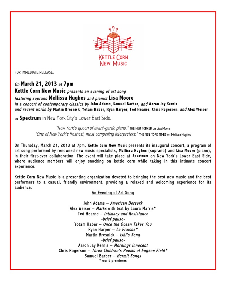 FOR IMMEDIATE RELEASE: On March 21, 2013 at 7pm Kettle Corn New Music presents an evening of art song featuring soprano Mellissa Hughes and pianist Lisa Moore ... Read Content